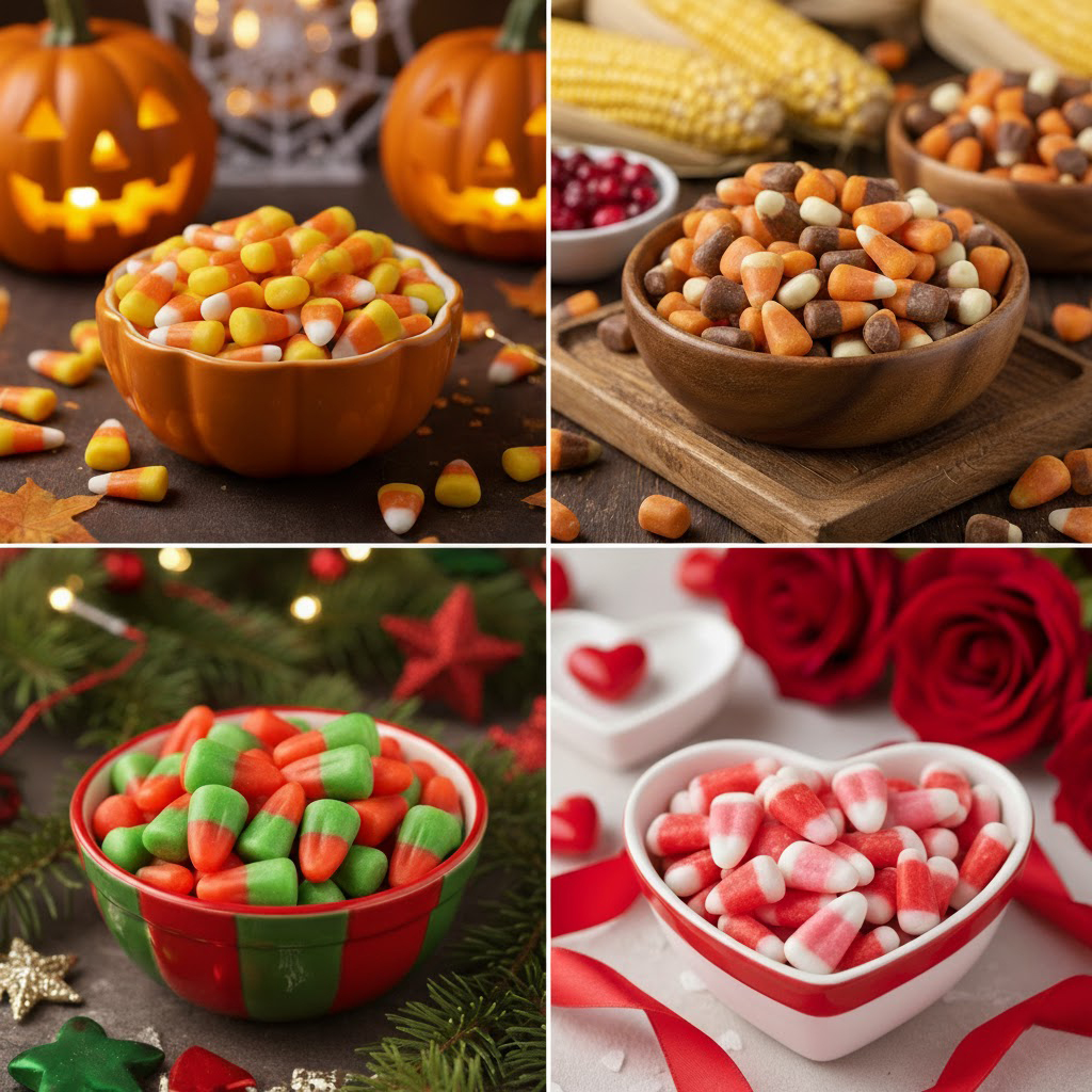 Aj keď klasická oranžovo-žlto-biela verzia dominuje počas Halloweenu, existujú rôzne farebné variácie kukuričných cukríkov prispôsobené iným sviatkom: