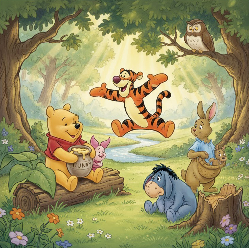 Tiger (Tigger): Energický a skákajúci tiger, ktorý miluje zábavu. Predstavuje hyperaktivitu a bezhraničný optimizmus. Niekedy je až príliš hlučný, no má dobré srdce.