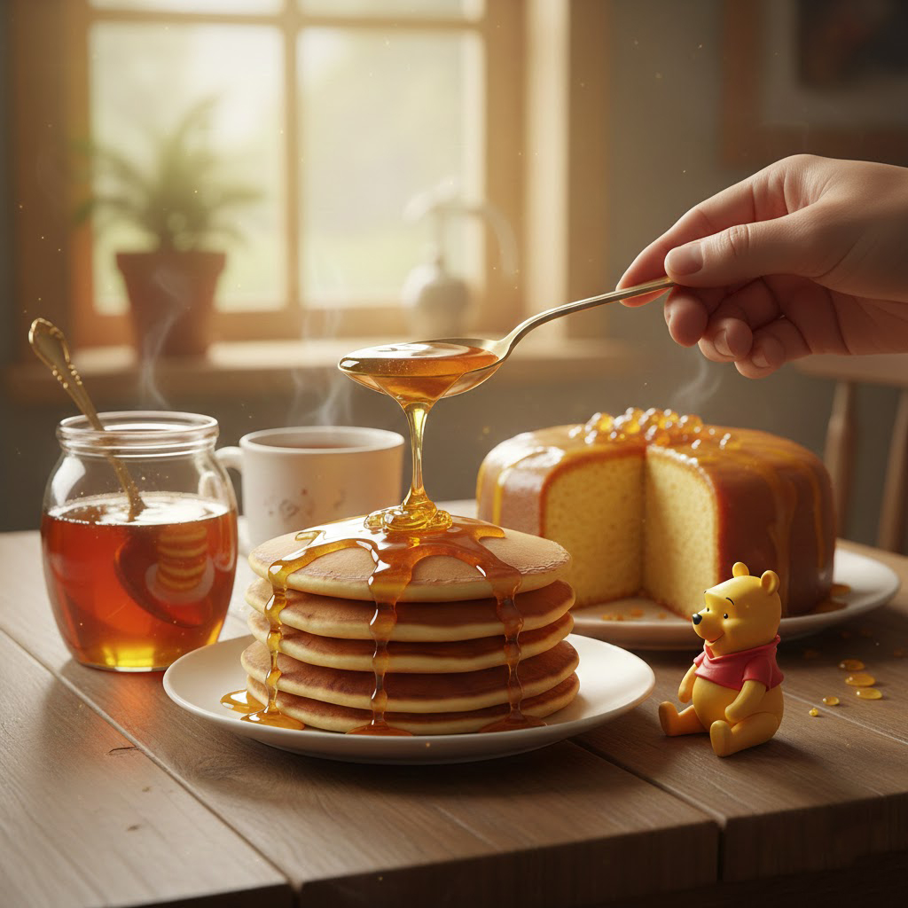 - Doprajte si niečo "mňamózne": Keďže Pú miluje med, pripravte si na raňajky lievance s medom, medový koláč alebo si oslaďte čaj poriadnou lyžicou tejto dobroty.