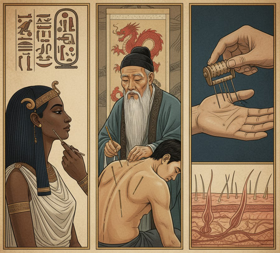 Korene techniky siahajú až k starodávnym akupunktúrnym praktikám a ranným metódam v dermatológii. Hoci nie priamo microneedling, už starí Egypťania používali na zlepšenie textúry pokožky rôzne ostré nástroje. Princípom mikrovpichov sa inšpirovala aj tradičná čínska medicína, hoci so zameraním na iné terapeutické ciele.