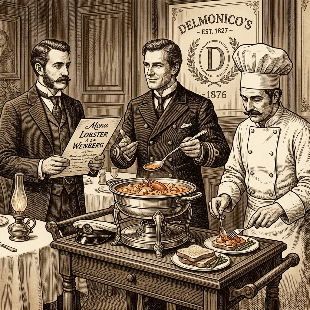 Príbeh začal v roku 1876, keď námorný kapitán Ben Wenberg, pravidelný hosť reštaurácie, prišiel za jej majiteľom Charlesom Delmonicom. Tvrdil, že počas svojich ciest objavil jedinečný spôsob prípravy homára. Charlesovi a jeho šéfkuchárovi predviedol recept priamo v reštaurácii a výsledok bol ohromujúci. Jedlo bolo okamžite zaradené do stáleho menu pod názvom Lobster à la Wenberg.