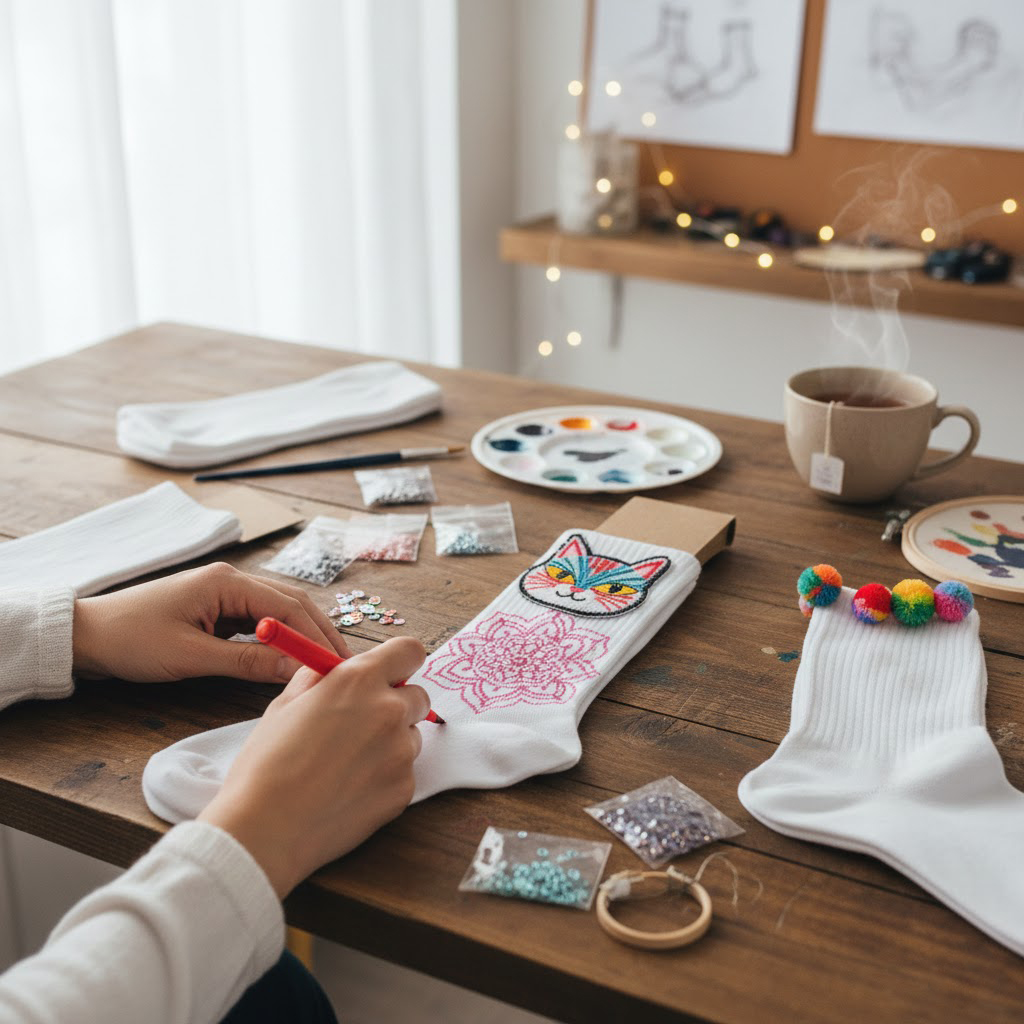 - Vytvorte si vlastné ponožky: Kúpte si jednofarebné ponožky a použite farby na textil, nášivky alebo iné ozdoby na vytvorenie vlastného jedinečného dizajnu.