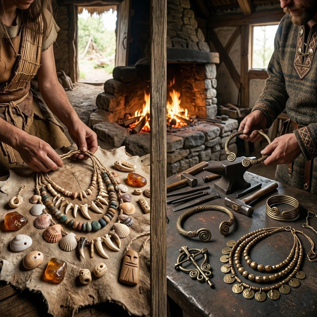 Zlom nastal v dobe bronzovej a železnej, keď ľudia objavili kovy. Začali sa objavovať prvé kovové spony, náramky a náhrdelníky, ktoré už nevyžadovali len zberateľskú zručnosť, ale skutočné remeselné spracovanie.