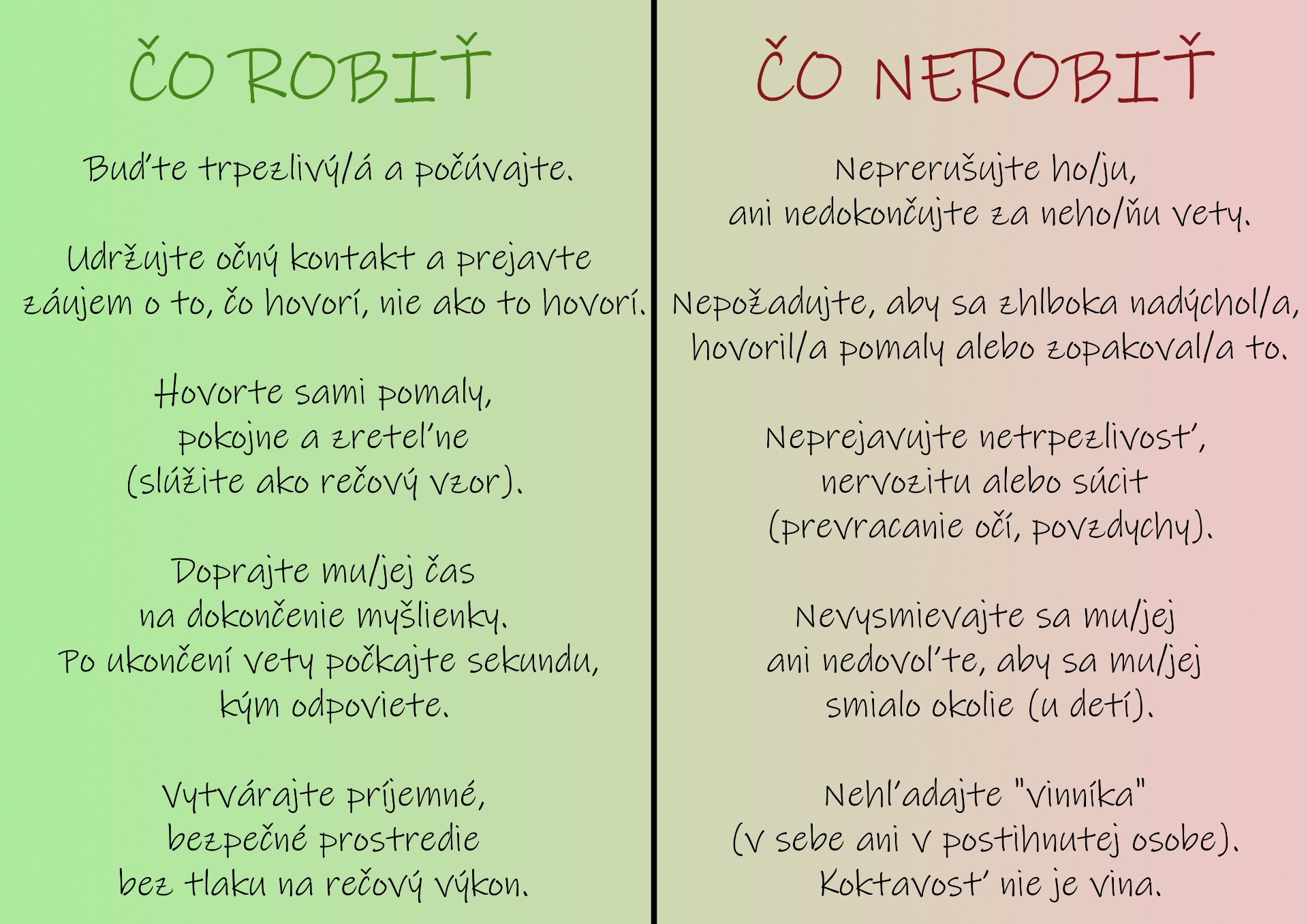 Pravidlá komunikácie: Pripomínajte si, ako správne komunikovať s človekom, ktorý koktá. Kľúčové je: